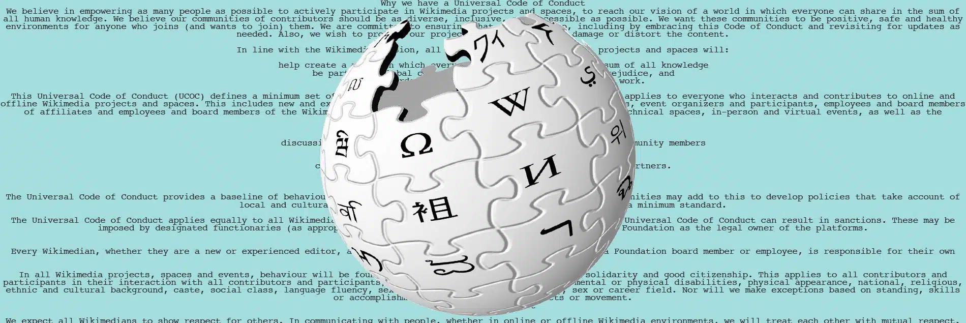 Limitar el comportamiento malicioso es uno de los objetivos del nuevo “Código Universal de Conducta” de la Fundación Wikimedia, el cual se aplica a las ediciones de Wikipedia en distintos idiomas y a sus proyectos relacionados. El código, que se publicó el 2 de febrero, consagra conceptos como el respeto mutuo y la civilidad, y deja en claro que el acoso, el abuso de poder y el vandalismo de contenido son inaceptables. Según la fundación, más de 1,500 voluntarios de Wikipedia, que representan a cinco continentes y 30 idiomas, participaron en la creación del nuevo código.
