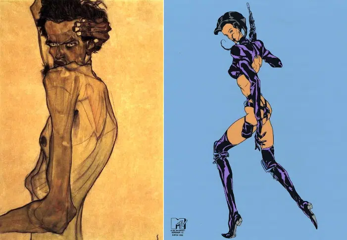 Egon Schiele, “Autorretrato con brazo doblado por encima de la cabeza”, 1910, e imagen promocional de Æon Flux, MTV.